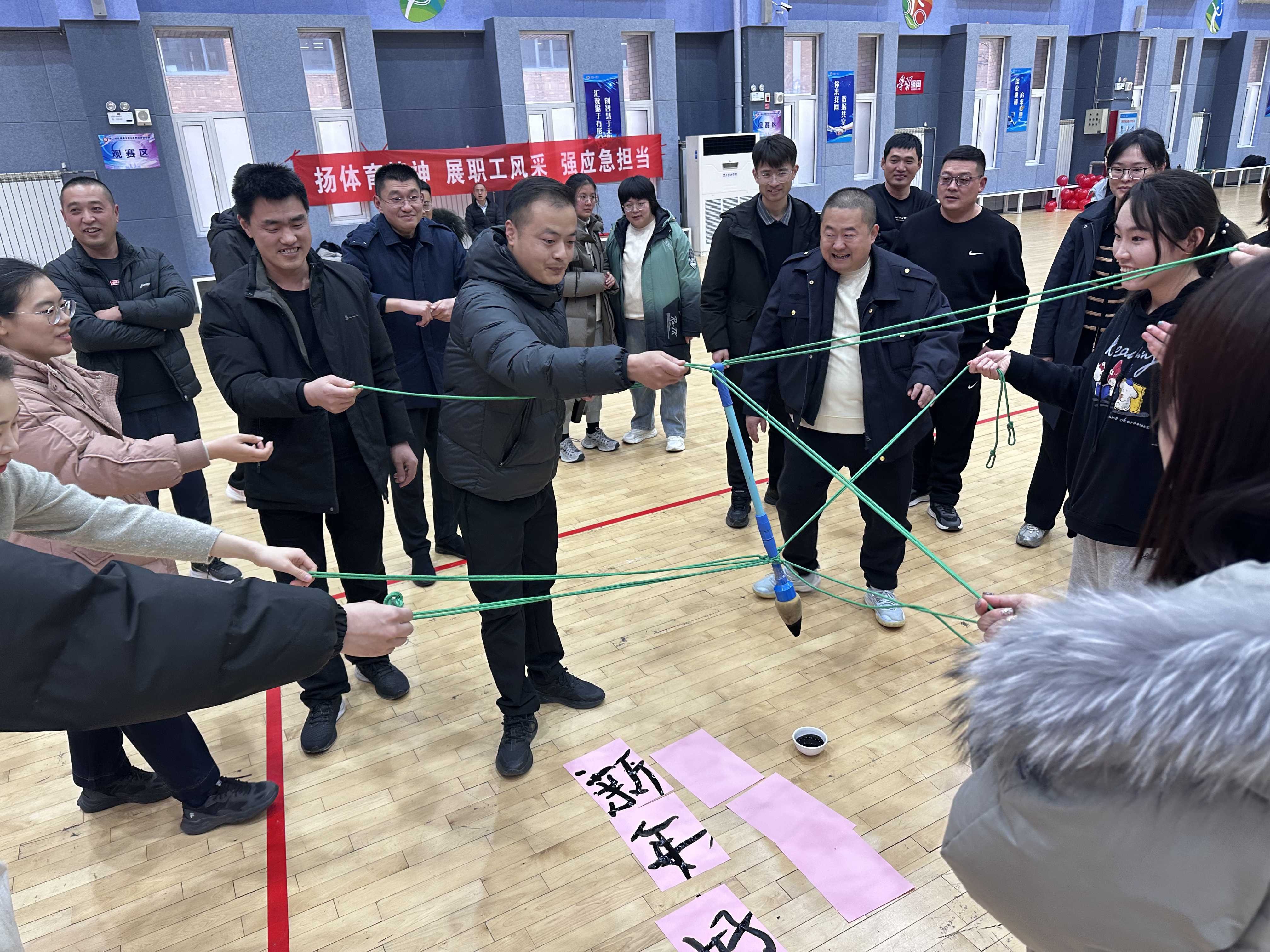 该项目要求团队成员通过牵引连接在一支巨型毛笔上的多根绳子,在不直接触碰笔杆的情况下,协同控制笔锋,共同在纸上完成指定词语的书写。